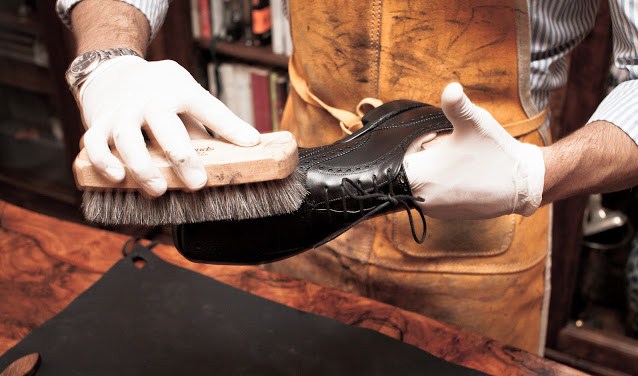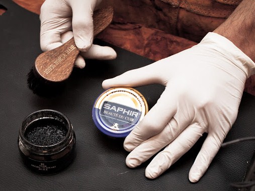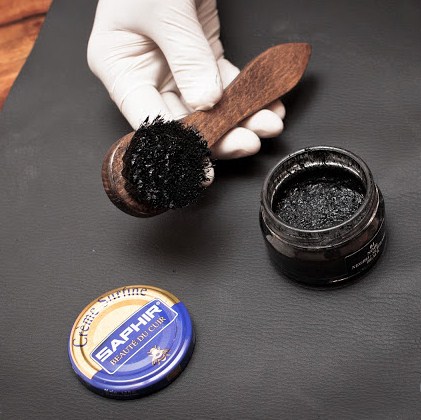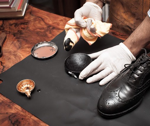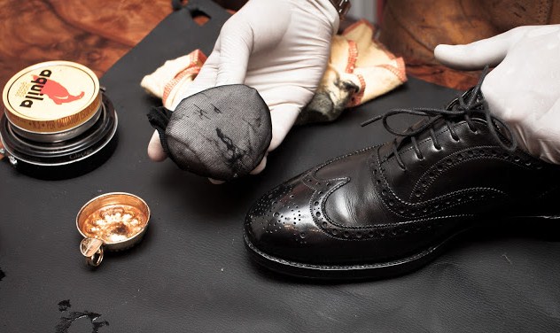 5) Con un panno arrotolato sulle dita, prendiamo una piccola quantità di acqua e whisky (o alcool) e di crema solida per lucidatura. Passiamo il panno imbevuto sulla scarpa con movimenti circolari e centrifughi e aggiungiamo qualche goccia d’acqua finché la scarpa non è lucida quanto si desidera (tempo: circa 20 minuti per paio).