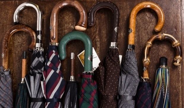 Hunting-collectionLa copertura può essere a pois, regimental, tinta unita, righe, principe di Galles e jacquard, mai stampati. Ultima fase, la scelta dell’impugnatura, applicata sul bastone: pelli pregiate cucite a mano, in colori diversi, ma anche corna, parte di palchi di cervo e montone, radici contorte ad arte dalla natura e perfino esotici denti di facocero. Tutto termina con la stiratura a vapore, a ombrello aperto.
