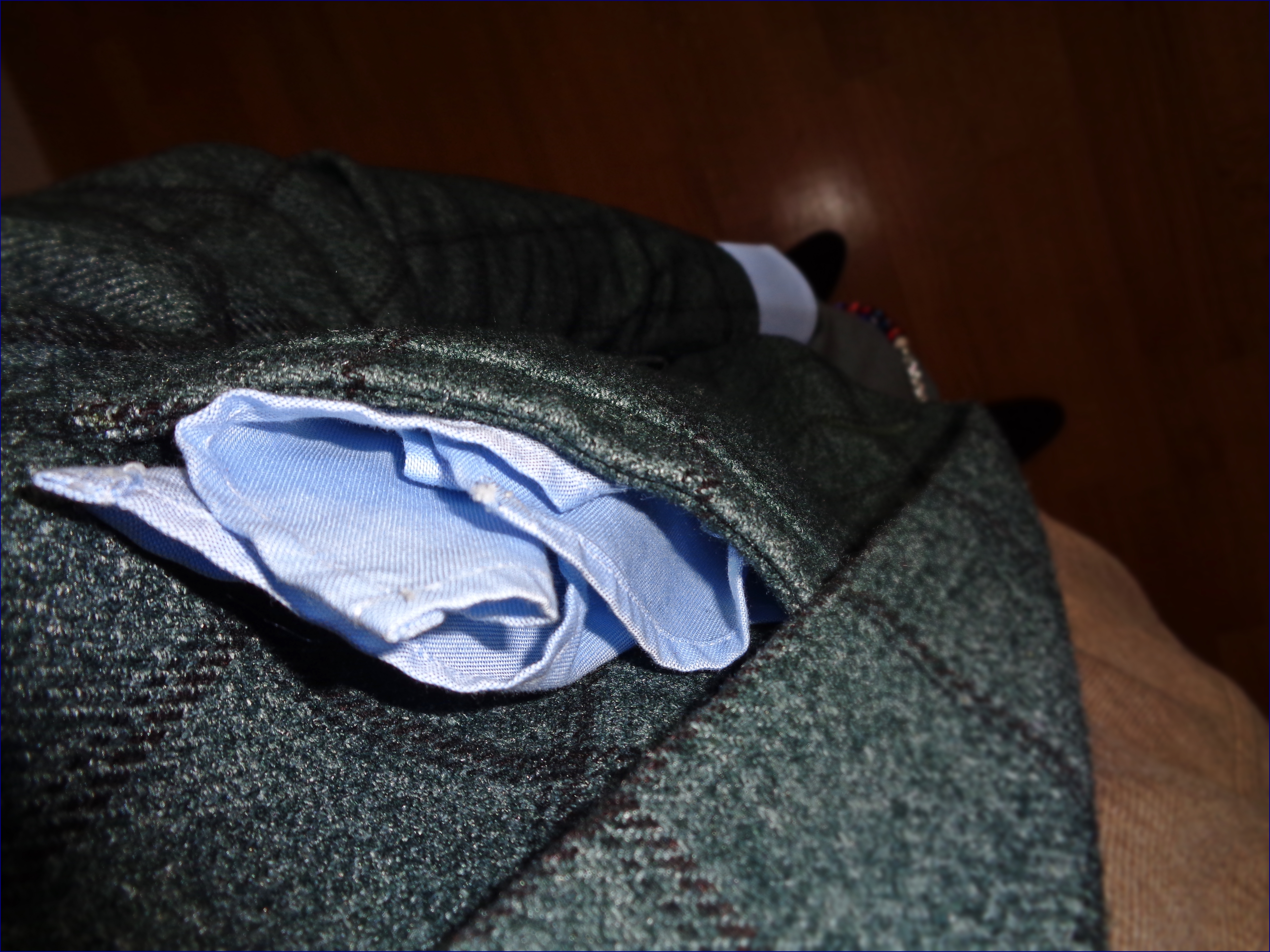 Il pantalone è stato “ripreso” in sartoria portando il fondo ai 16 cm, mentre la giacca presenta asole funzionali e doppio spacco posteriore.