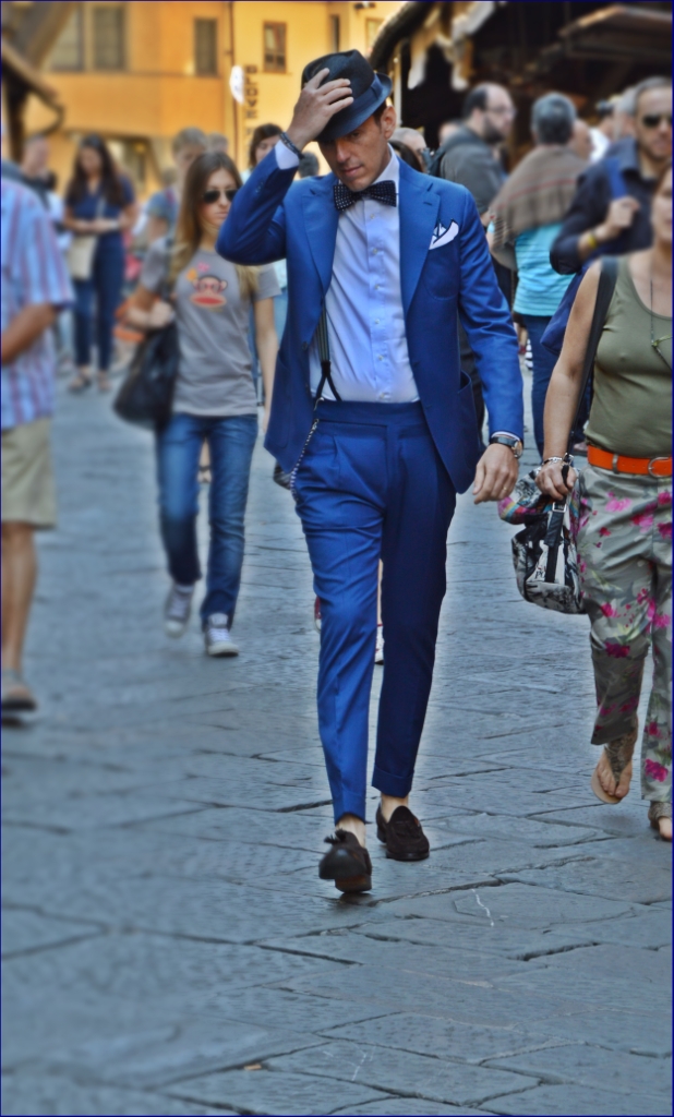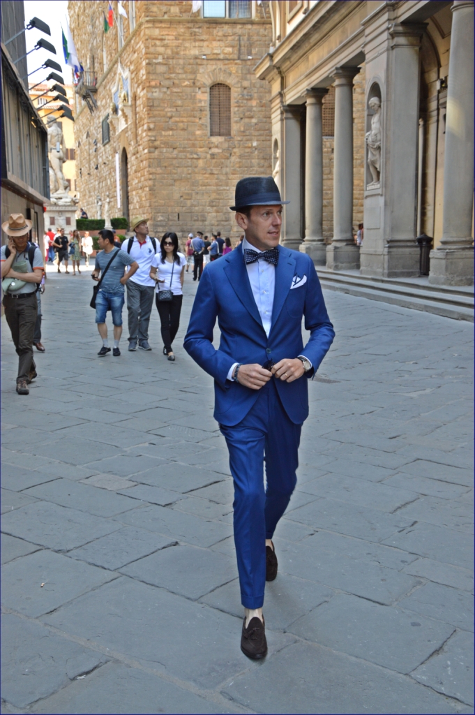 Dimostrazione di quest’ultima affermazione sono i numerosi personaggi che si sono succeduti nelle varie giornate, delle quali cercherò di dare conto sotto aspetti differenti. Il primo di tre articoli dedicati al Pitti estivo appaga il mio ego maschile, narcisista e perché no, anche volutamente accentuato in alcuni particolari, che trova la sua istigazione e provocazione nella scelta meticolosa ed attenta del look. Il mio ovviamente non fa eccezione alla regola! Ho scelto un abito in fresco di lana super 140s del peso specifico di 240 grammi, realizzato a mano dalla sartoria TreErre di Roma, che ringrazio per la pazienza e la serietà dimostrata.