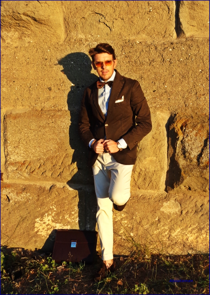 I propose an outfit that takes directly in the summer, as colors and fabrics. I chose a pair of trousers and a cream jacket “tailored” in pure cotton with effect slightly aged, brown color. To complete the outfit “pied de poule” shirt white and blue, vintage bow tie in pure silk and brown belt in suede lobster, paired with a pair of moccasins made by hand. The glasses are Rayban lenses cytrus very restful;-)