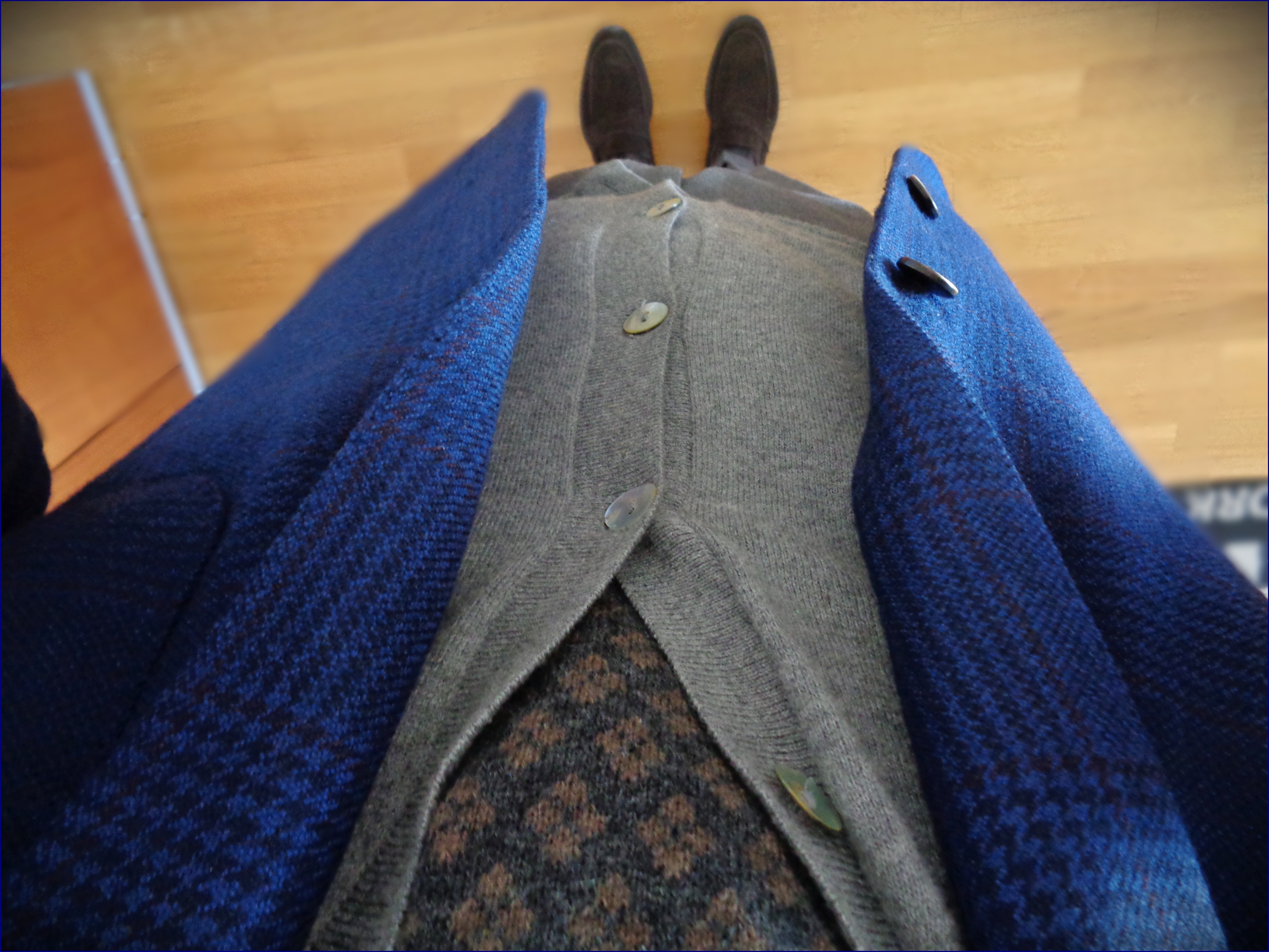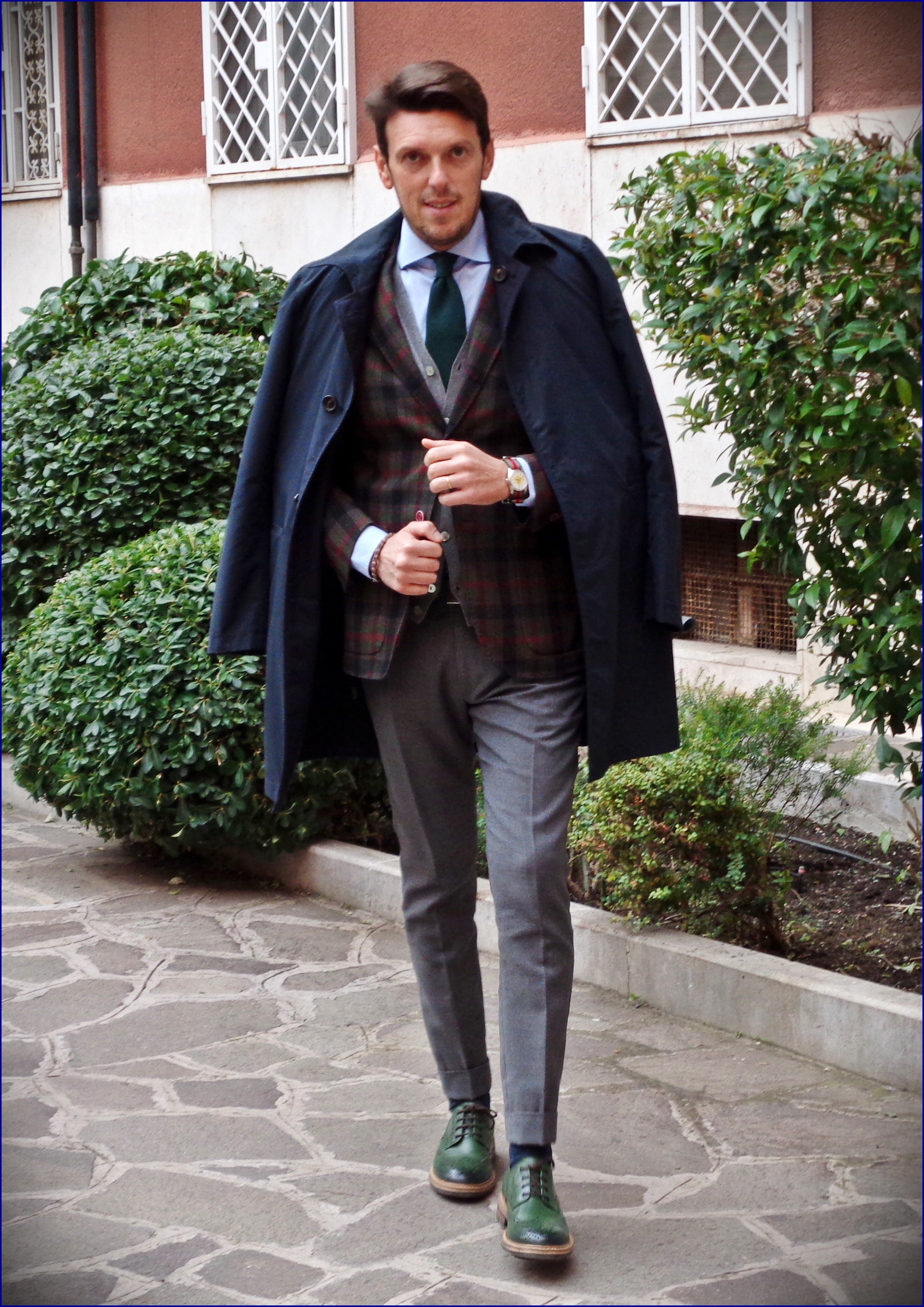 Pertanto, avendo accesso limitato agli armadi di casa ho pensato di realizzare due differenti outfits “da ufficio” che potrebbero andar bene in questi giorni “freddini” al mattino e più tiepidi all’ ora di pranzo, utilizzando, per entrambi gli abbinamenti, un pantalone grigio in tasmania super 120, un gilet, sempre grigio in cotone e cashmere, ed una camicia su misura celeste polvere.