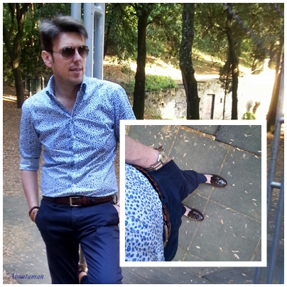 Ho voluto combinare un pantalone blu con tasca dritta, in cotone leggermente elasticizzato, opportunamente ristretto con un fondo a 16 cm, una camicia Erreffe con disegni floreali fatta su misura ed un paio di mocassini con nappine di Prada. Completano il tutto accessori vintage, quali una cinta intrecciata presa in un mercatino dell’usato tempo fa, ed un Omega anni 60 al polso.